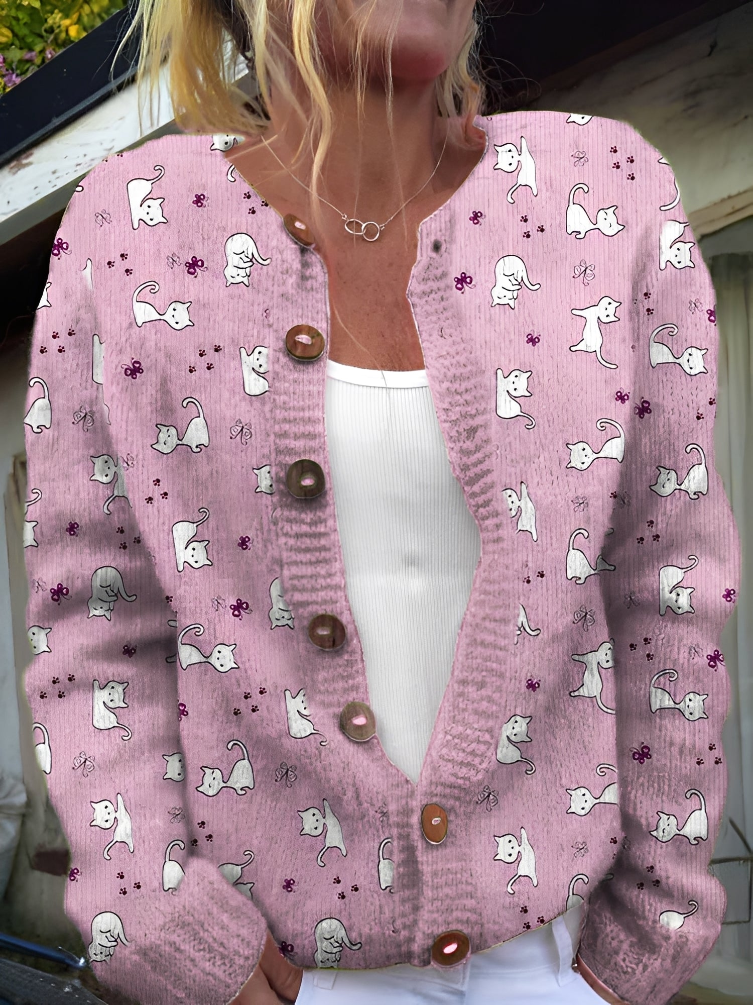 Motifs floraux féminins pour une touche élégantePolyvalent – parfait pour les loisirs et le quotidienUn cardigan qui fait de chaque tenue un point fort.