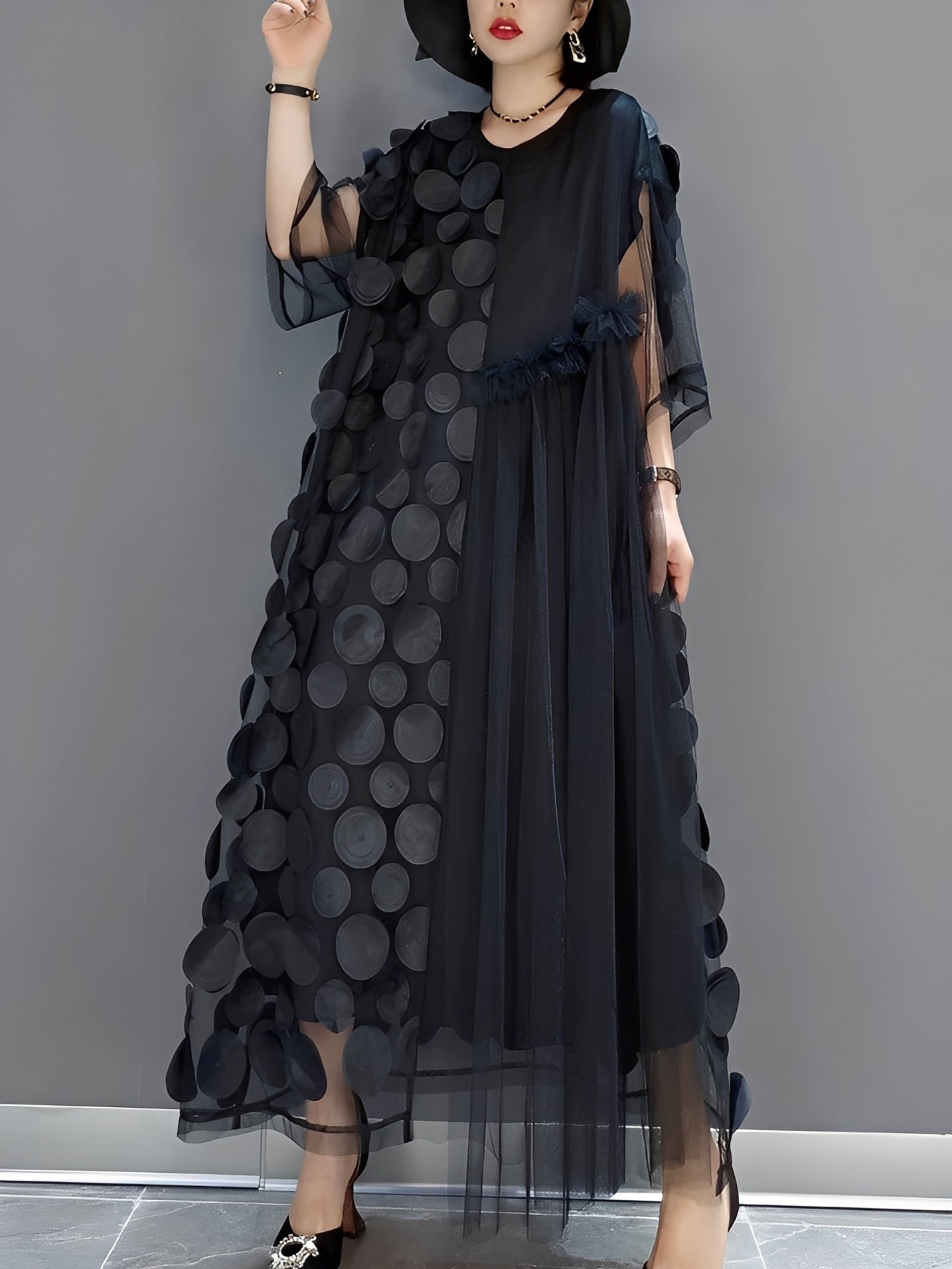La robe Kassandra impressionne par son style léger en tulle et ses manches asymétriques qui apportent une touche moderne au look. Le col rond classique assure une beauté intemporelle, tandis que la coupe ample offre liberté de mouvement et confort. Idéale pour les fêtes, les soirées ou les dîners élégants. Une robe qui allie élégance féminine et charme festif.