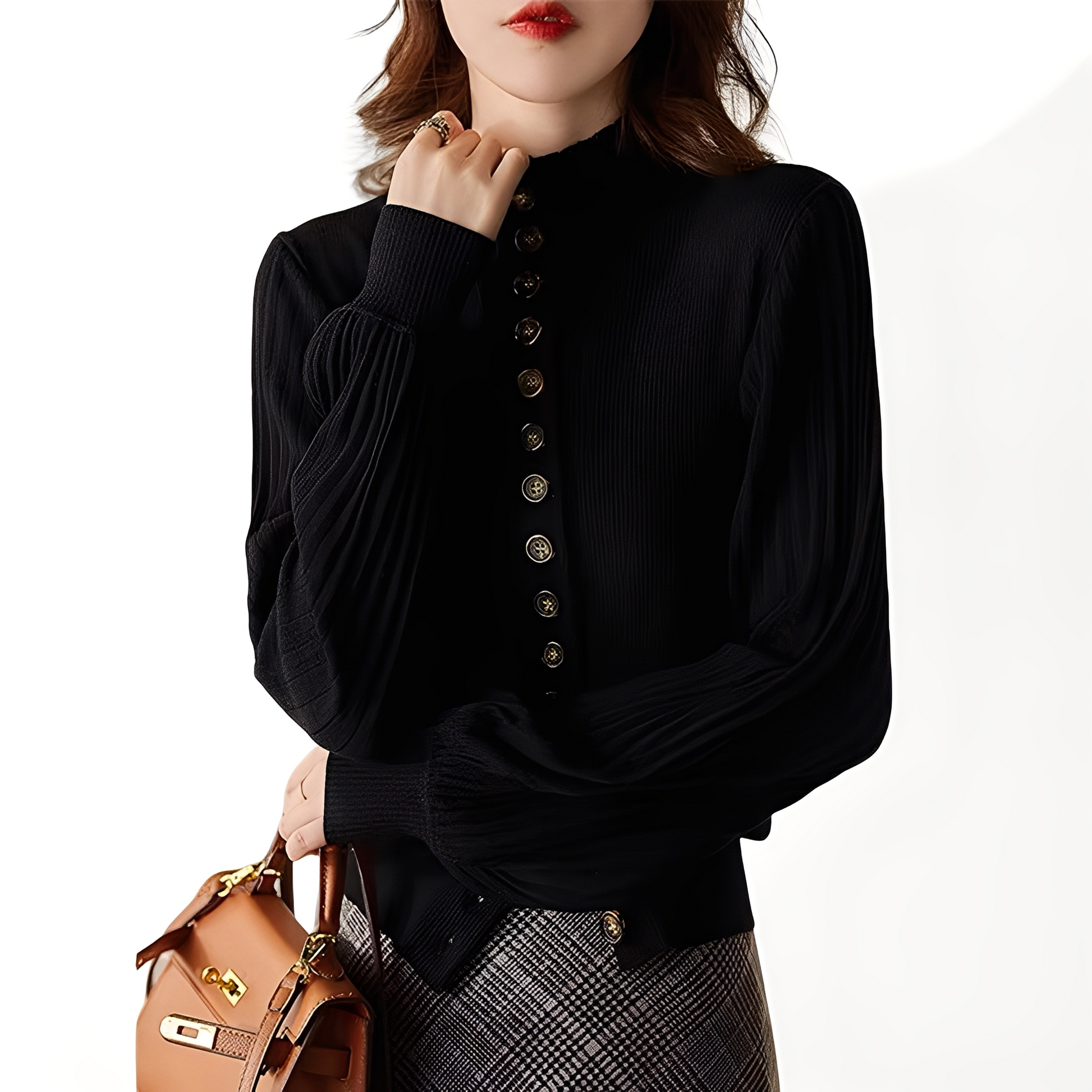 Sweter Adelyn łączy klasyczną elegancję z nowoczesnymi elementami. Wysoki dekolt i dekoracyjne guziki nadają bluzce elegancki charakter, podczas gdy szerokie rękawy oferują kobiecy i lekki styl. Idealny, by dodać elegancji codziennym stylizacjom lub nosić na wyjątkowe okazje.