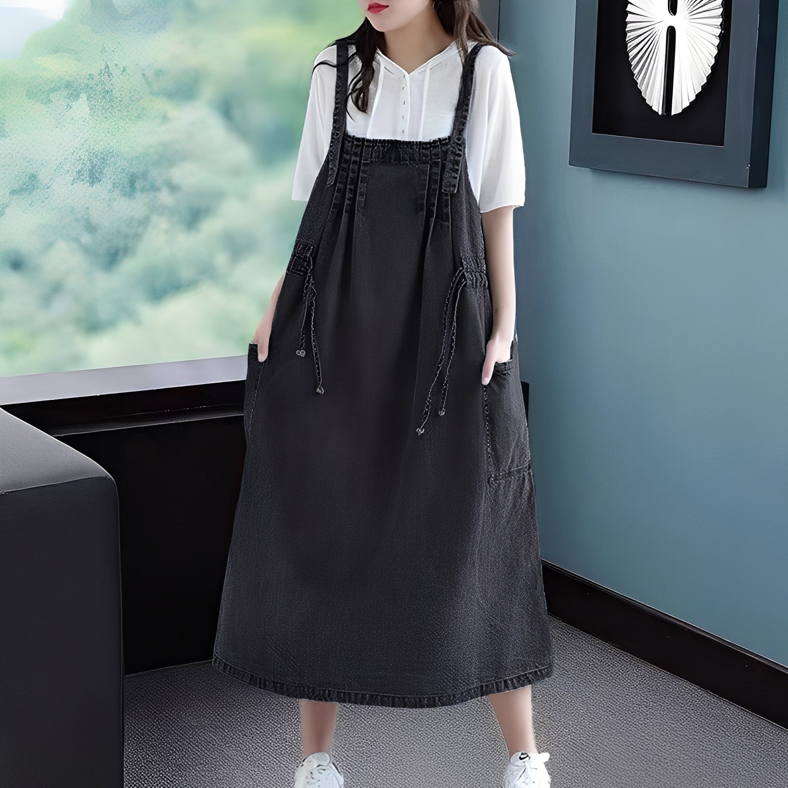 Sukienka dżinsowa „Kelsey" zachwyca luźnym krojem i wąskimi ramiączkami. Praktyczny sznurek w talii zapewnia indywidualne dopasowanie, a kieszenie dodatkowy komfort. Wykonana z bawełnianego denimu, jest oddychająca i idealna na ciepłe wiosenne dni oraz lato.