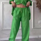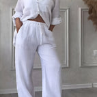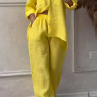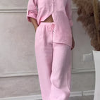 Das Brandie Set verbindet Bequemlichkeit und Schick in einem modernen, zweiteiligen Outfit. Hergestellt aus einer angenehmen Baumwoll-Leinen-Mischung, ist es perfekt für sonnige Tage. Das Set hat ein locker sitzendes Oberteil mit halblangen Ärmeln und eine weit geschnittene Hose mit Gummizug, die viel Bewegungsfreiheit gibt. Die schlichte Optik kann vielseitig kombiniert werden – für lässige Alltagslooks oder stilvolle Auftritte im Urlaub. Brandie bringt einen frischen Touch in Ihre Sommerkleidung.