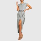 Das Cess – Midi Kleid Lässig verbindet Einfachheit und Eleganz durch seinen lässigen Schnitt und den verstellbaren Taillengürtel. Der sanfte Rundhalsausschnitt und die kurzen Ärmel sorgen für einen schmeichelhaften und angenehmen Look, während der überkreuzte Rock mit dezenten Schlitzen für Bewegungsfreiheit sorgt. Perfekt für entspannte Tage oder informelle Ausflüge, kombiniert dieses Kleid Komfort und Stil mit einem Hauch von Raffinesse.