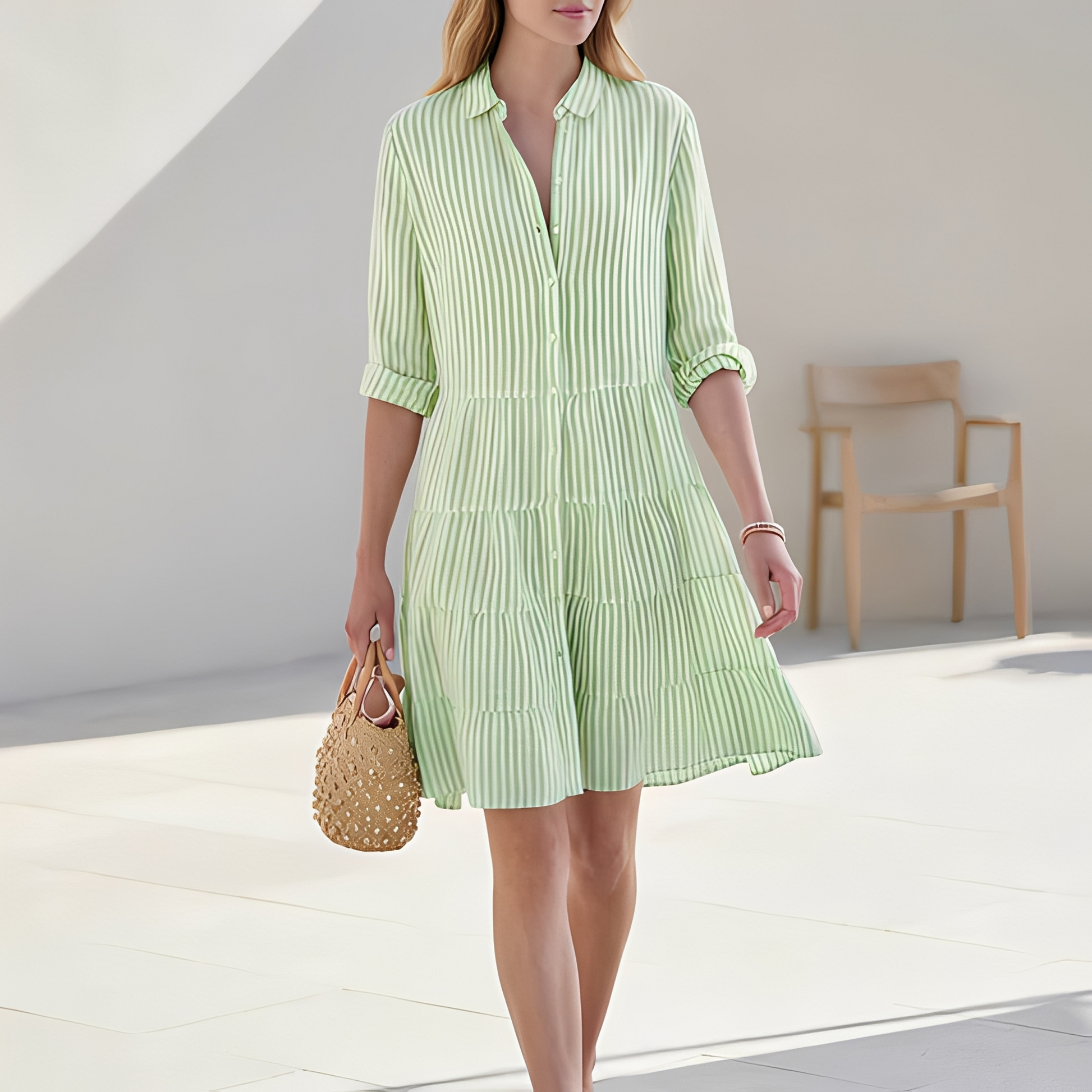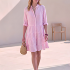 Das SommerhemdkleidElijahist für Frauen gedacht, die an heißen Tagen natürlichen Stil und maximalen Komfort wollen. Die luftige, gerüschte Form bietet einen lockeren und trotzdem eleganten Look, der bei jedem Schritt stilvoll mitgeht. Das klassische Design des Hemdkleides bringt einen Hauch von Eleganz und behält dabei seinen entspannten und vielseitigen Stil. Leicht und atmungsaktiv, perfekt für Urlaub, Brunch, Einkaufen oder den täglichen Gebrauch. Tragen Sie es mit Sandalen, Sneakers oder Absätzen für ein simples, aber schickes Sommeroutfit.