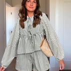 Entdecken Sie den ultimativen Sommerlook mit dem 'Lola Sommer-Set': ein Damen-Set aus Top und Shorts mit lockerem Schnitt, hoher Taille und Boho-Streifen-Design! Dieses koordinierte Set, bestehend aus einem weiten Top mit langen Ballonärmeln und hoch taillierten gestreiften Shorts, ist perfekt für heiße Tage und einen mühelosen Stil. Das Top hat einen Rundhalsausschnitt mit Knotendetail und eine geraffte Taille für eine schmeichelhafte Passform.