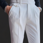 Diese Hosen verbinden traditionelle britische Schneiderkunst mit einem frischen Look. Sie bestehen aus leichtem, atmungsaktivem Material, ideal für Frühling und Sommer. Das plissierte Vorderteil und der anpassbare Bund bieten eine auffällige Passform, während der lockere obere Teil und das sich verjüngende Bein stilvolle Bequemlichkeit geben. Egal ob mit Hemd oder T-Shirt – sie ergänzen jeden Stil mit entspannter Eleganz.