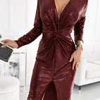 Die Maria – Funkelndes Abendkleid wurde entworfen, um im Rampenlicht zu stehen. Mit glitzernden Pailletten, die das Licht aus verschiedenen Blickwinkeln reflektieren, präsentiert sich dieses Kleid sowohl schick als auch kühn. Der tief ausgeschnittene V-Ausschnitt und das gedrehte Detail vorne betonen die Figur, während der seitliche Schlitz einen Hauch von Raffinesse und Verführung hinzufügt. Die langen Ärmel sorgen für ein harmonisches Gesamtbild und verleihen der Eleganz des Kleides eine dramatische Note.