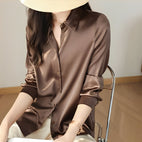 Ergänzen Sie Ihre Garderobe mit unserer Satinbluse mit langen Ärmeln und Knöpfen, wo Eleganz und alltäglicher Komfort zusammenkommen.