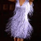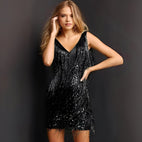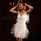 Beeindrucken Sie mit unserem eleganten und stilvollen Cocktailkleid, das durch seine Detailverliebtheit mit Fransen und Federn besticht.