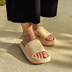 Der höhere Absatz im Vergleich zu den Zehen (≈15°) richtet die Haltung auf und entlastet das Fußgewölbe. Die ultra-weichen Riemen schmiegen sich an den Fuß, während die Sohlentextur Ihren Füßen bei jedem Schritt eine leichte Massage bietet.