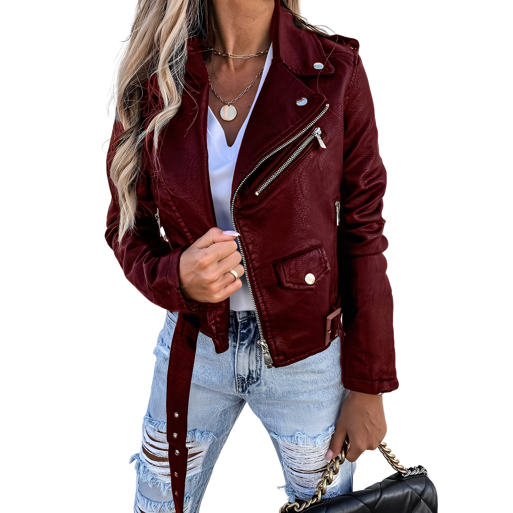 Diese Retro-Bikerjacke verleiht jedem Outfit einen kraftvollen und stilvollen Auftritt. Das glatte Material und die auffälligen Reißverschlüsse bringen den typischen Biker-Charme zur Geltung, während der feminine Schnitt eine elegante Silhouette bietet. Sie ist sehr bequem und kann vielfältig mit Jeans, Kleidern oder Röcken kombiniert werden. Perfekt für Frauen, die zeitlosen Stil mit moderner Lässigkeit verbinden möchten.
